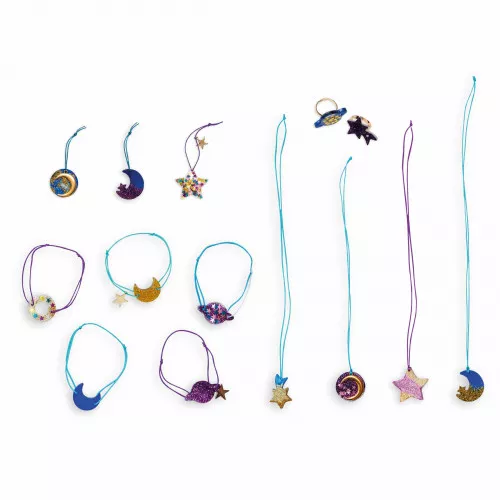 Voici un kit qui permet de créer ses propres bijoux en résine, une super idée pour les passionnés de bracelets, bagues et colliers en tout genre ! Grâce à la technique de la résine, complément sûre pour les enfants, ils vont pouvoir, dès 8 ans, faire leurs propres réalisations sur un thème qui leur est cher, l’espace avec ses étoiles et ses planètes ! Ce kit créatif permet de fabriquer 14 bijoux grâce à la technique de résine liquide auto-durcissante. Le coffret est composé de résine et de son catalyseur, de moules en silicone, d’un tube de colorant, d’une coupe à mesure, d’une paire de gants, de 2 tubes de paillettes, d’un tube de petites étoiles, de fil, d’un bâtonnet, de breloques et d’un support de bague. Un livret d’instructions permettra aux enfants d’avancer pas à pas et en toute sécurité dans la création. Paillettes, breloques, étoiles, de multiples accessoires permettent de rendre les bijoux brillants et de leur donner un magnifique rendu. Cette activité développe l’autonomie et la concentration. Les enfants seront fiers d’avoir réalisé leur propres bijoux et pourront les offrir ! Cette activité nécessite 1 heure de préparation, 24 à 48 heures de séchage, et 1 heure 30 minutes à 2 heures pour le montage des bijoux.