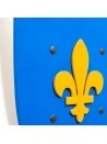 Bouclier en bois contre-plaqué. Modèle Historik GM. Fleur de lis en relief collée. 2 poignés derrière en cuir synthétique fixés avec des rivets métalliques.
