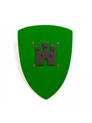Bouclier en bois contre-plaqué. Petit modèle Kamelot. Château en relief collé. 2 poignés derrière en cuir synthétique fixés avec des rivets métalliques.