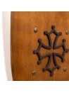 Bouclier en bois contre-plaqué. Grand modèle Rustik. Croix en relief collée. 2 poignés derrière en cuir synthétique fixés avec des rivets métalliques.