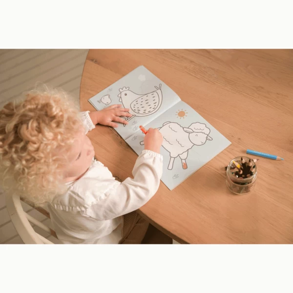 La vache, le petit lapin et leurs amis ont perdu leurs couleurs ! Aide-les avec tes talents d’artiste. Ce livre de 24 pages divertira votre enfant avec ses dessins de lapin, de bâteau… Il lui permettra de développer sa patience, son habileté manuelle et sa coordination oeil/main. En plus, qu’est-ce qu’il sera fier de vous présenter ses œuvres !