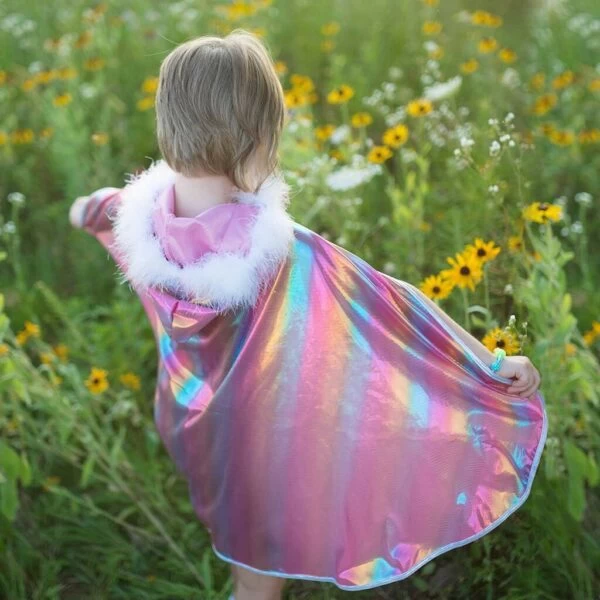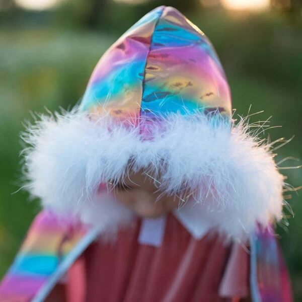 Le tissu de la cape Arc-en-Ciel est imprimé avec des couleurs arc-en-ciel holographiques avec un liseré argenté pour encore plus de brillance.