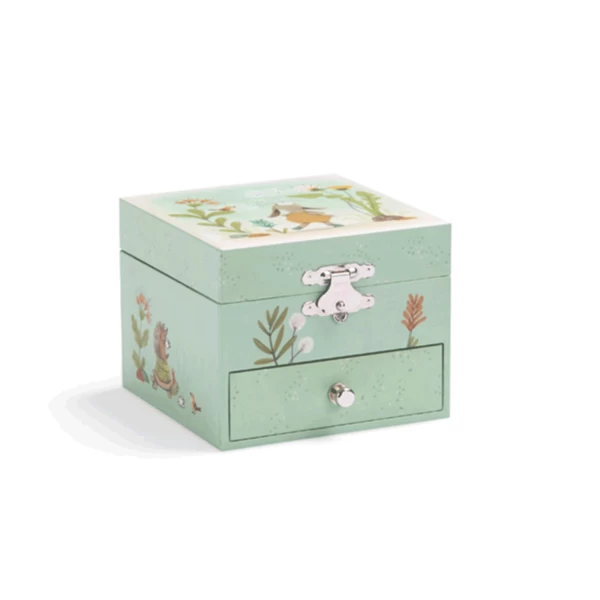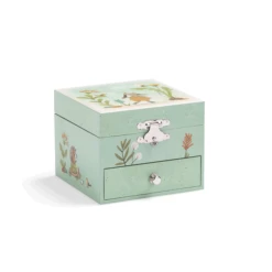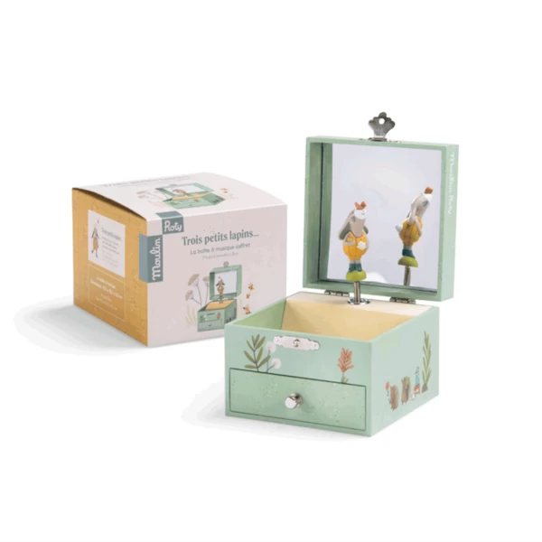 Découvrez ce délicat coffret boîte à musique où un lapin tourne sur lui-même au son de la musique lorsqu’on l’ouvre. Son copain le papillon s’est posé délicatement sur le bout de son nez ! Ce coffret délicatement décoré permet de déposer tous les petits objets auxquels on tient et un tiroir gardera même les secrets !