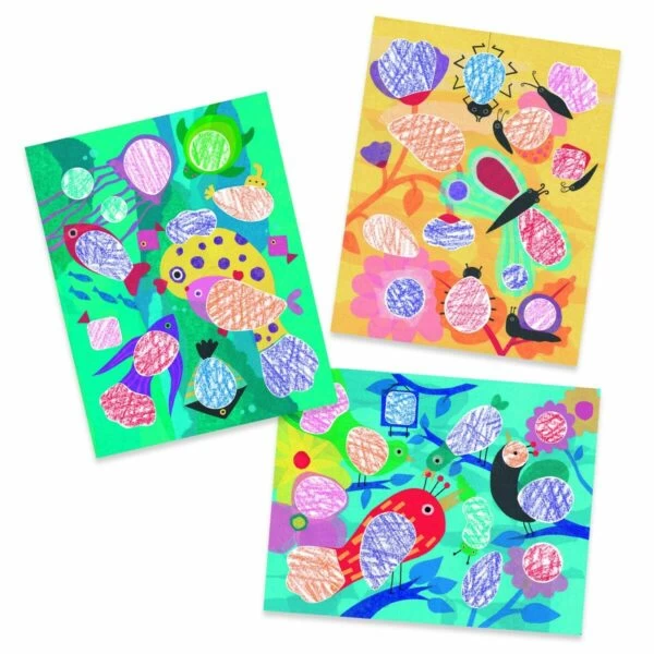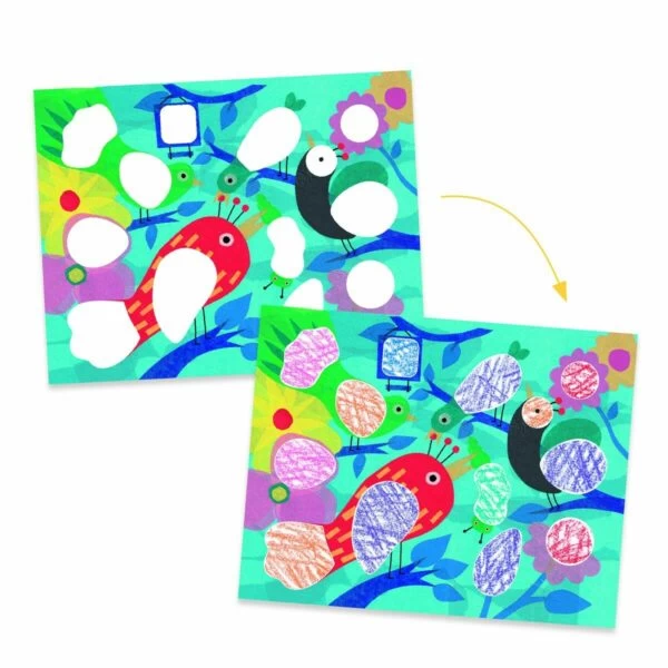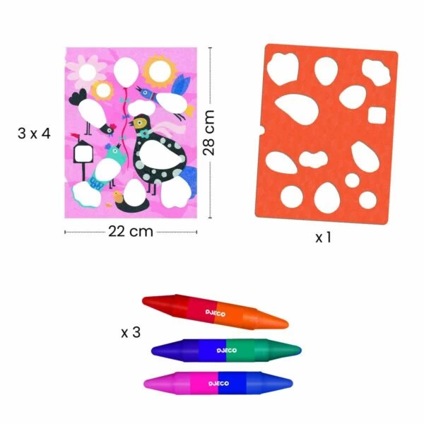 Contenu : 2 feuilles illustrées à colorier, 1 pochoir épais, 3 crayons de cire double côtés (6 couleurs) et 1 livret explicatif pas-à-pas.