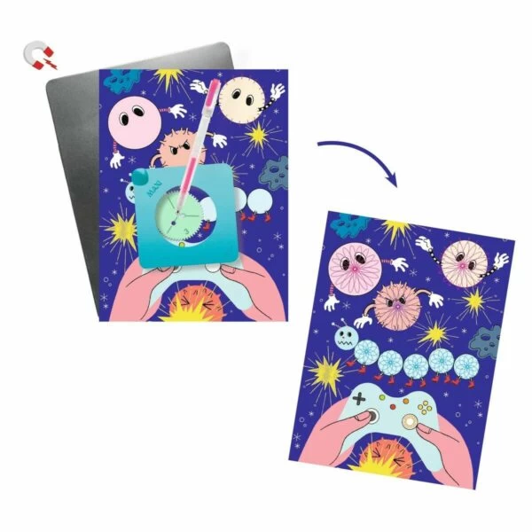 Découvrez ce Coffret dessin Spirales avec ses 10 thèmes illustrés. Un coffret de dessin pour réaliser de superbes spirales colorées et ainsi compléter les planches proposées dans ce bloc de 30 pages dont les illustrations couvrent 10 thèmes différents. Une activité classique revisitée grâce à des outils astucieux qui permettent de réaliser les spirales sans bouger ! L’enfant pose sa feuille sur la plaque de métal, puis applique le cadre aimanté dans lequel il insère la roue crantée. Muni de son stylo, il décrit des cercles pour dessiner facilement sa rosace sans avoir à maintenir le cadre en place.