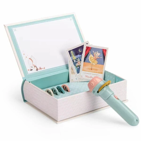 Contenu : 1 coffret aimanté, 1 lampe à histoires, 5 disques à projeter et 5 invitations