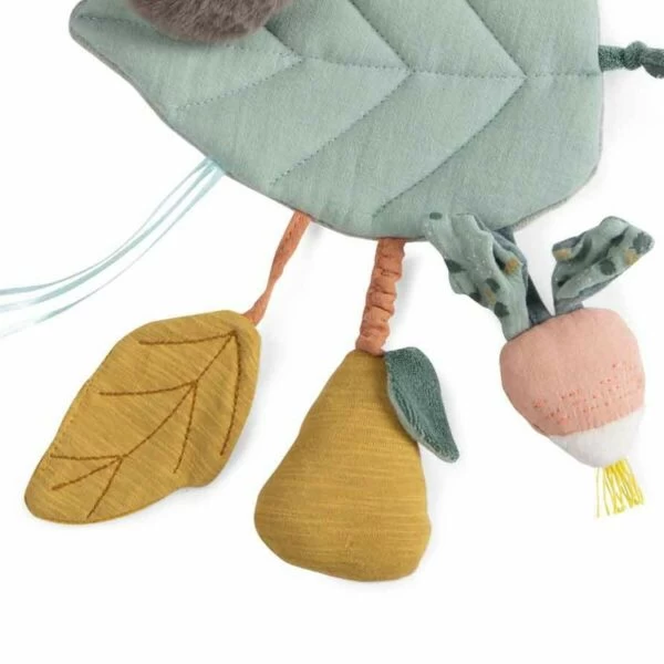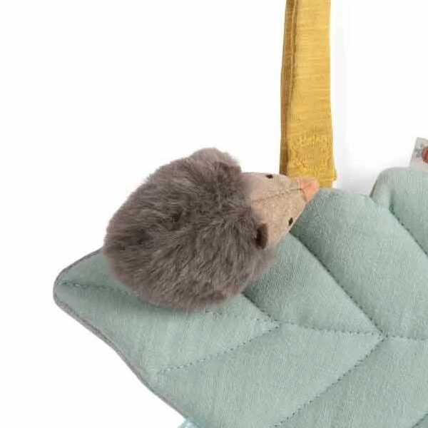 La feuille comprend plusieurs éléments suspendus, notamment un petit hérisson, une feuille qui fait scritch, la poire qui fait pouët.