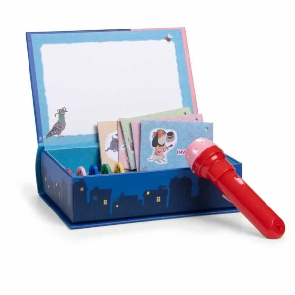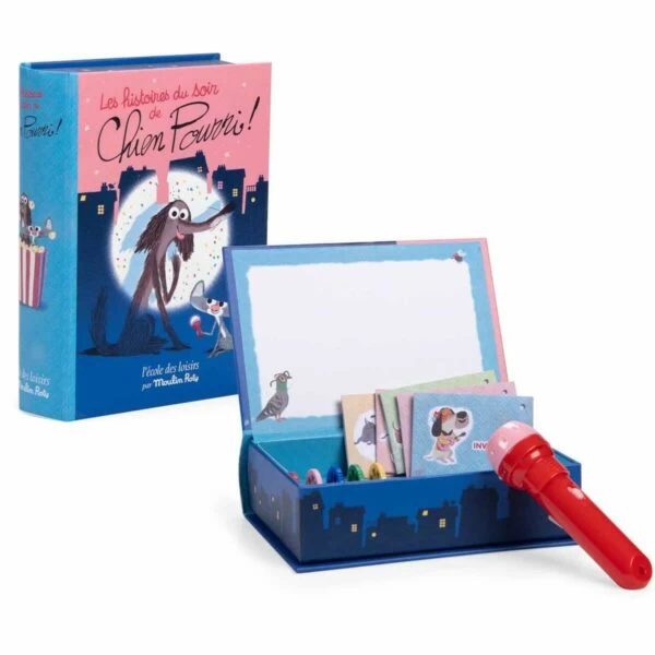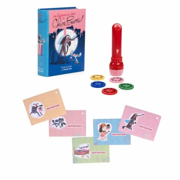 Cette boîte comprend une lampe à projeter et 5 disques pour imaginer de belles histoires avant de s’endormir le soir. Elles racontent les aventures délirantes de Chien pourri, un héros farceur On éteint la lumière pour que la magie opère et c’est parti… on se plonge dans le pays des rêves !! À chaque tour on peut raconter une nouvelle aventure. Seule l’imagination (et peut-être la fatigue…) viendront à bout de cette lampe.