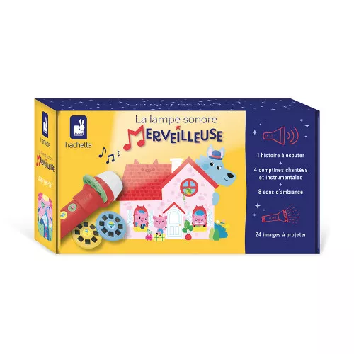 Qui a peur du grand méchant loup ? Avec la Lampe Sonore Merveilleuse « Loup, y es-tu ? », les enfants à partir de 3 ans profitent de récits amusants dans l’univers des contes avec leur propre lampe à histoires. Téméraire, parfois lourdaud mais toujours rigolo, notre ami le loup vit sans cesse de drôles de péripéties dans les histoires des petits ! Invitez votre bambin dans un univers magique et donnez vie aux récits avec cette conteuse d’histoires ludique ! Cette jolie lampe est bien plus qu’une simple lampe de poche pour enfant. En effet, elle combine un projecteur d’images et une conteuse sonore, créant ainsi une expérience immersive pour les tout-petits. 9 minutes de son sont disponibles au total : l’incontournable histoire des « Trois petits cochons » d’une durée de 4,6 minutes, 4 comptines accompagnées de leurs versions instrumentales d’une durée de 2,7 minutes (« Promenons-nous dans les bois », « Le loup, le renard et la belette », « Le loup a des poux », « Le grand loup du bois ») et 8 sons thématiques immersifs de 95 secondes. Du son mystérieux du vent dans les arbres aux bruits de pas dans les feuilles, votre enfant s’évade alors dans une forêt où se déroulent de folles d’aventures. Notre lampe à histoires est livrée avec 3 rondelles correspondant chacune aux 3 boutons de la lampe et contenant 8 images, ainsi qu’un pochon de rangement. Pratique et nomade, cette lampe se glisse aisément dans un sac à dos pour divertir les enfants même dans les transports. Son utilisation intuitive permet aux petits de prendre le contrôle en toute autonomie. Préparez-vous à des moments magiques et amusants au moment du coucher ou pendant un temps calme, que ce soit en utilisant la lampe de manière autonome ou en l’utilisant vous-même pour conter les histoires à votre enfant. Les trois boutons, chacun associé à une rondelle d’images, permettent à votre enfant de choisir l’univers qui l’accompagnera dans le monde des contes. Alimentée par 2 piles AAA (non incluses), notre lampe sonore merveilleuse est prête à éclairer les rêves de votre tout-petit. Son design malin ne s’arrête pas là ! La lampe est livrée avec un pochon de rangement en coton : pas besoin de chercher sous les draps ou dans tous les recoins au moment de l’histoire du soir, la Lampe Sonore Merveilleuse de Janod trouve rapidement sa place dans la chambre de votre enfant. Offrez-lui une nuit remplie de féerie et d’aventures avec la Lampe Sonore Merveilleuse – Loup y es-tu ?, conçue en collaboration avec la maison d’édition Hachette. Lampe sonore, lampe à projection et conteuse d’histoires : l’imagination de votre enfant est décuplée !