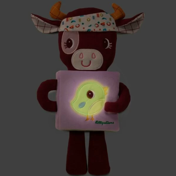 Bébé va adorer le livre doudou phospho Rosalie, faire et refaire les activités proposées et manipuler ce livre en tissu tout doux. Il va aussi pouvoir faire des câlins à la vache Rosalie. Quand la lumière s’éteint, Rosalie est là pour rassurer votre enfant jusqu’à ce qu’il s’endorme. Le livre devient veilleuse. L’illustration sur la couverture s’éclaire.