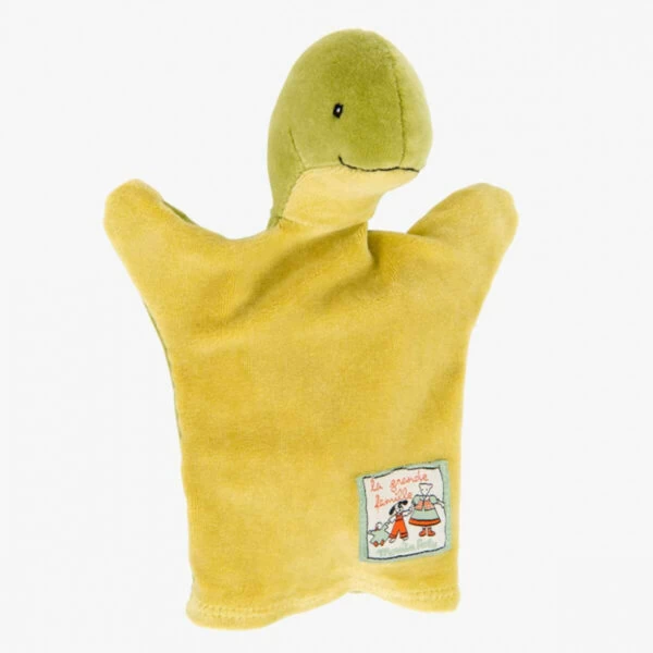 La marionnette doudou Camille la tortue de la collection La Grande Famille est une marionnette à main de couleur verte qui représente une jolie tortue toute douce avec sa carapace sur le dos.
