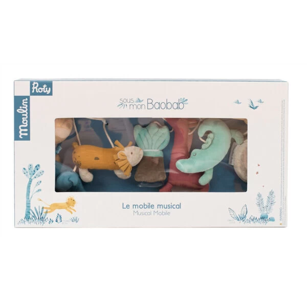 Livré dans une magnifique boîte cadeau, le mobile musical Sous mon Baobab est un très bel objet de décoration de la chambre de Bébé et participe aussi à son éveil auditif et visuel.