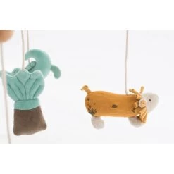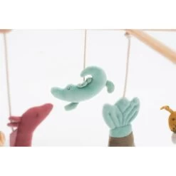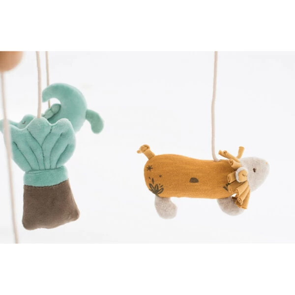 Chaque animal est une petite peluche aux finitions très soignées. Bébé adorera observer la girafe rose , l’éléphant bleu, le crocodile vert pâle et le lion orangé. Tous dansent autour d’un baobab.
