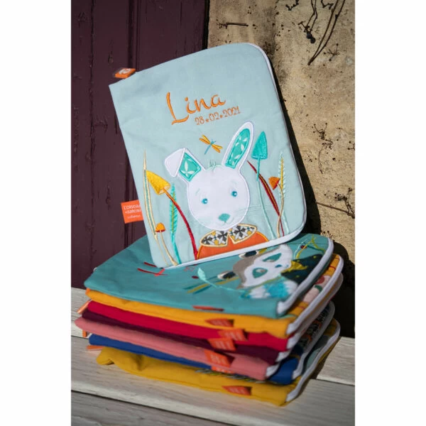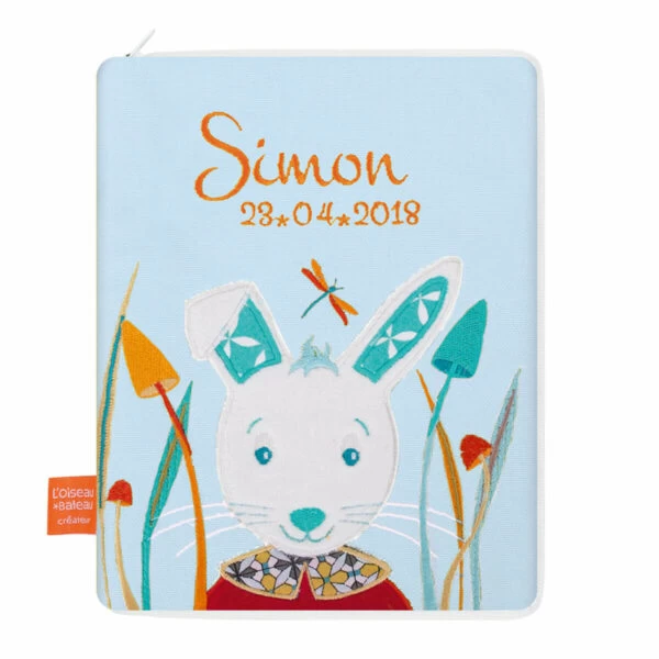 Ce beau protège carnet de santé brodé au prénom de l’enfant et inspiré du personnage de Lapin d’Alice est un indispensable dès la naissance.