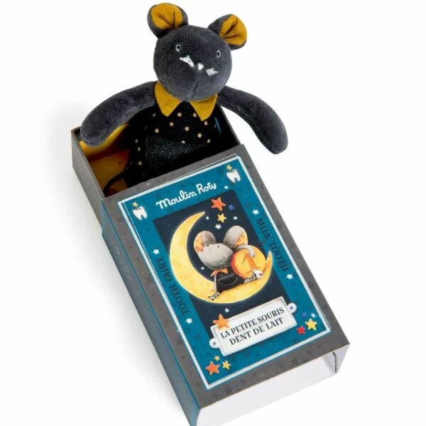 Elle est conçue dans des couleurs douces et pastel, avec un corps en tissu tout doux, une petite queue en feutrine et de grandes oreilles rondes. La souris est équipée d’une petite poche aux reflets d’or où l’enfant peut mettre sa dent de lait perdue avant de la glisser sous son oreiller pour que la fée des dents puisse la récupérer.… Après, elle se range dans sa jolie boîte illustrée.