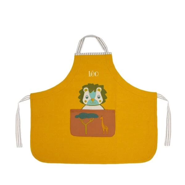 Tablier brodé et personnalisable LION, décoré d’un adorable compagnon espiègle, un petit lion. Ce tablier brodé est personnalisable au prénom de l’enfant.