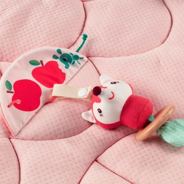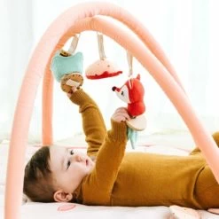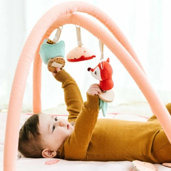 Ce tapis d’éveil Alice la renarde sur le thème de la forêt est en jersey biologique, très épais et très moelleux. Bébé va adorer y être allongé. Il ne risque rien, il est en sécurité dans ce petit nid douillet ! Les arches peuvent être ôtées et les hochets qui étaient suspendus peuvent être accrochés au tapis.