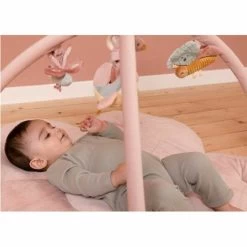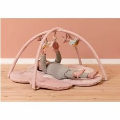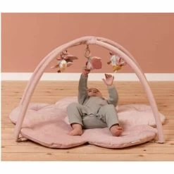 Chaque jour est une aventure nouvelle pour un petit enfant couché sur ce tapis. Le tapis rose a été doté de deux grands arcs en velours côtelé d’où pendent 5 peluches différentes. L’oiseau, le moineau, la fleur et les papillons aident les petits à développer les capacités sensorielles tout en stimulant la coordination main-œil.