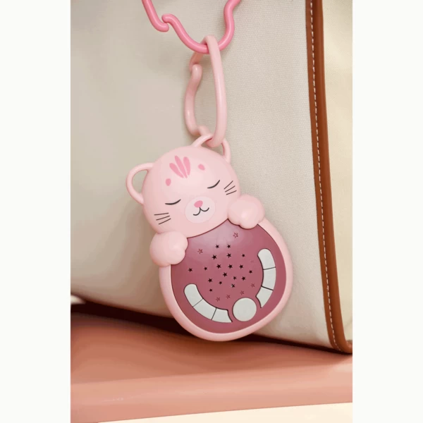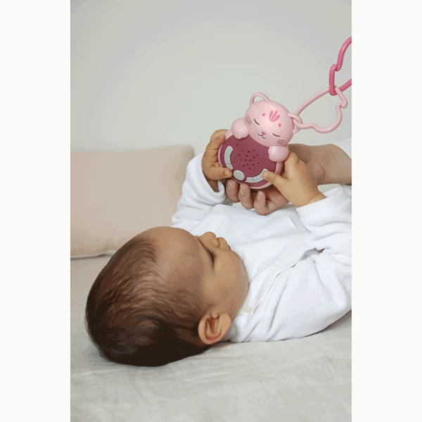 Adorable veilleuse nomade multisensorielle en forme de chat rose, équipée de mélodies et de sons apaisants.