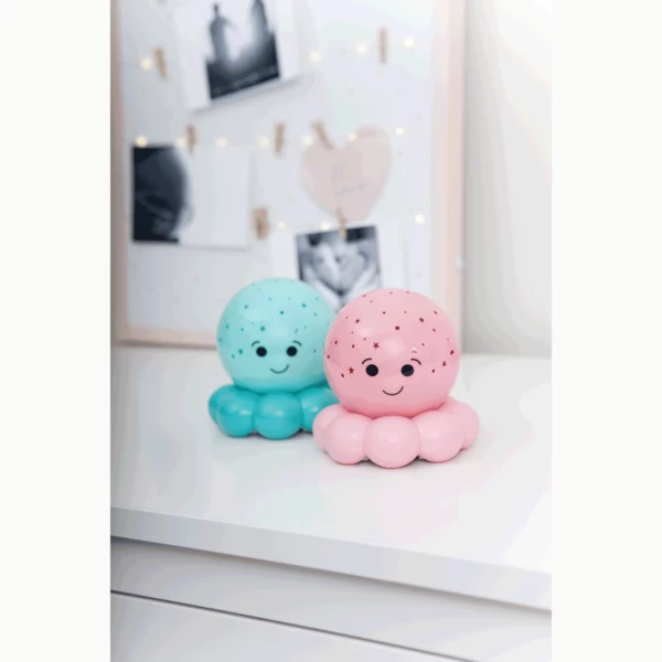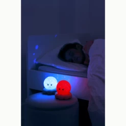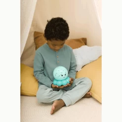 Vers 18 mois, il est très courant que la peur du noir se manifeste chez l’enfant. La nuit est pour lui le moment où les dangers imaginaires deviennent possibles. Le jeune enfant veut laisser la lumière allumée ou dormir avec la porte de sa chambre ouverte. Le rituel du coucher peut devenir plus compliqué et si l’enfant se réveille la nuit dans le noir, il n’a plus de repères. Dans la nature, les soirs où le ciel est dégagé, l’obscurité est atténuée par la lueur des étoiles et des poissons et des bulles. Cette atmosphère rassurante est ainsi recréée dans la chambre des petits avec cette Veilleuse à projections lumineuses en forme de bébé pieuvre.